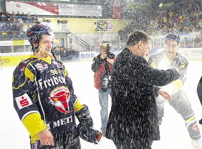 Eine Sektdusche für den Trainer: Carsten Gosdeck (rechts) lässt sich das nach dem Viertelfinaleinzug nicht nehmen, Thomas Götz (links) steht die Freude ins Gesicht geschrieben.Foto: Gunnar Schulze