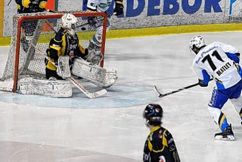 Drin, das Ding: Mark heatley erzielt das 2:1, der EHC zieht durch das 6:1 ins Halbfinale ein. Foto: BSE