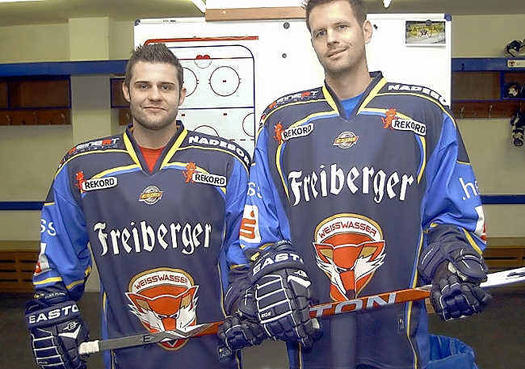 Präsentieren die neuen Heimtrikots: Stürmer Danny Albrecht (l.) und Verteidiger Sven Valenti. Foto: André Kurtas
